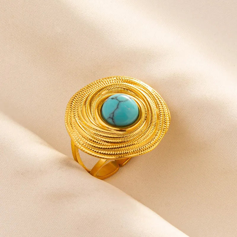 Elevate your elegance with the Aurora Turquoise Ring, a timeless statement piece designed to shine with sophistication. The radiant 18K gold-plated finish is beautifully complemented by a striking turquoise stone, symbolizing calm, balance, and effortless beauty.