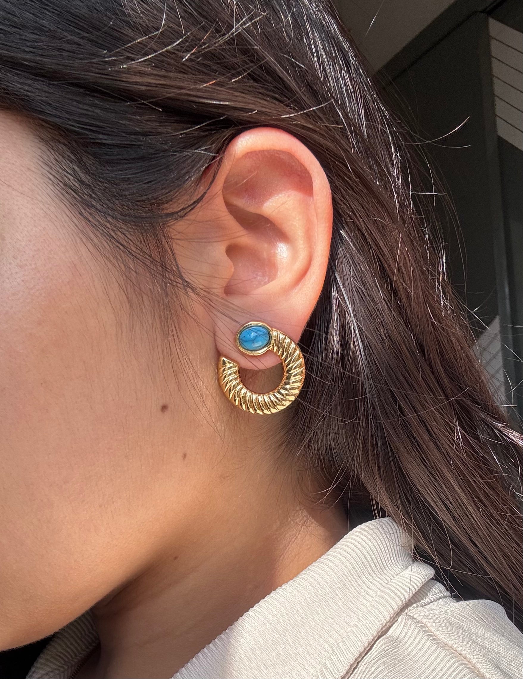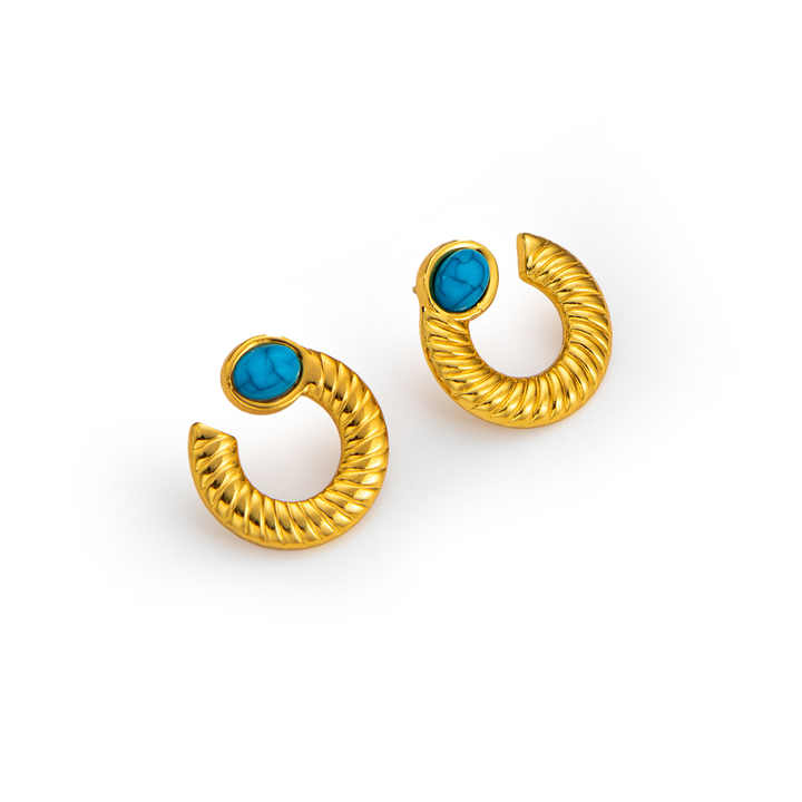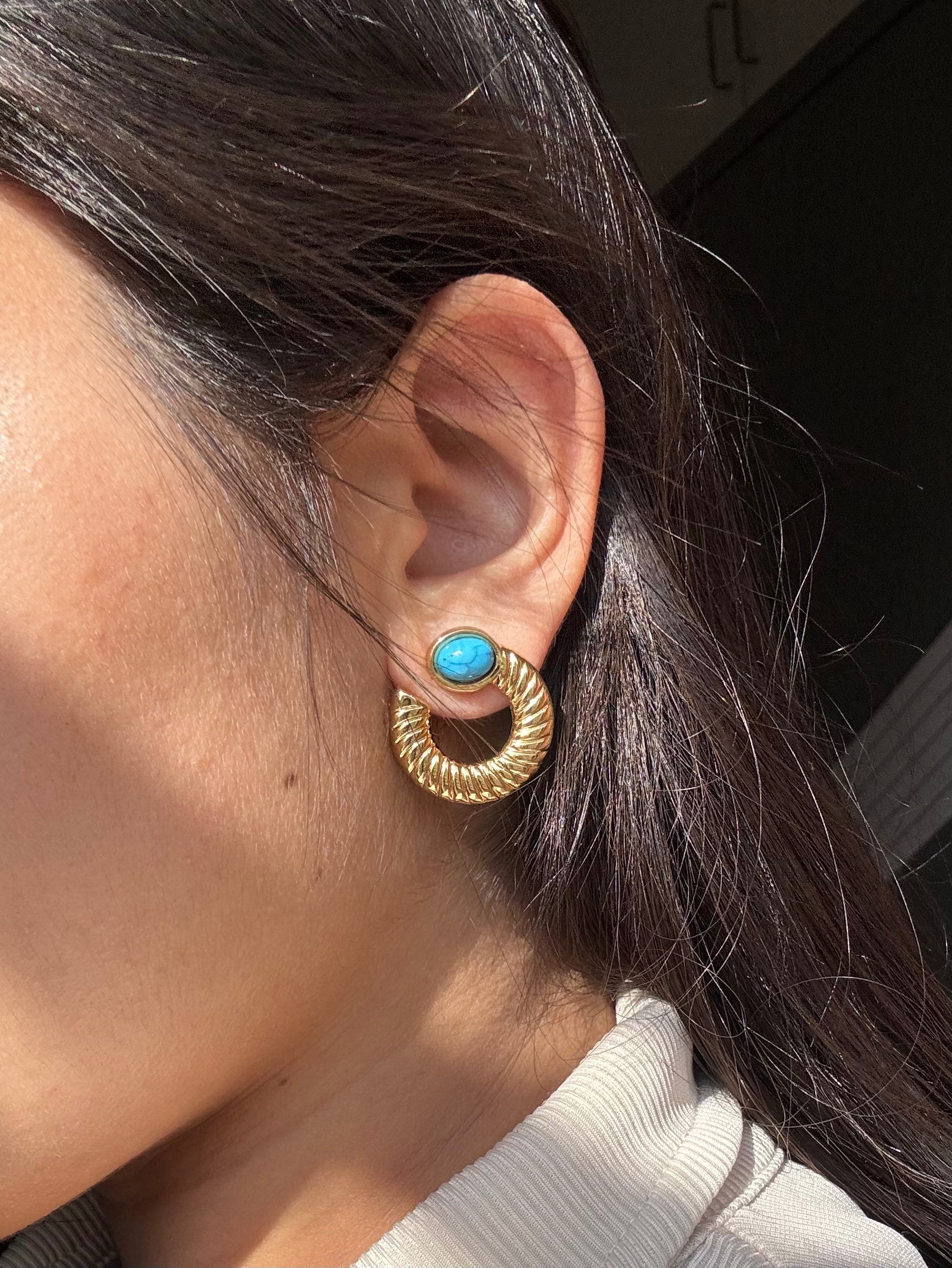 Elevate your jewelry collection with our Azure Twist Hoop Earrings, a perfect fusion of modern elegance and timeless charm. Featuring a unique twisted gold hoop design accented with a striking turquoise stone, these earrings exude sophistication with a touch of bohemian flair. The intricate detailing and vibrant blue hue make them a standout accessory for any occasion.
