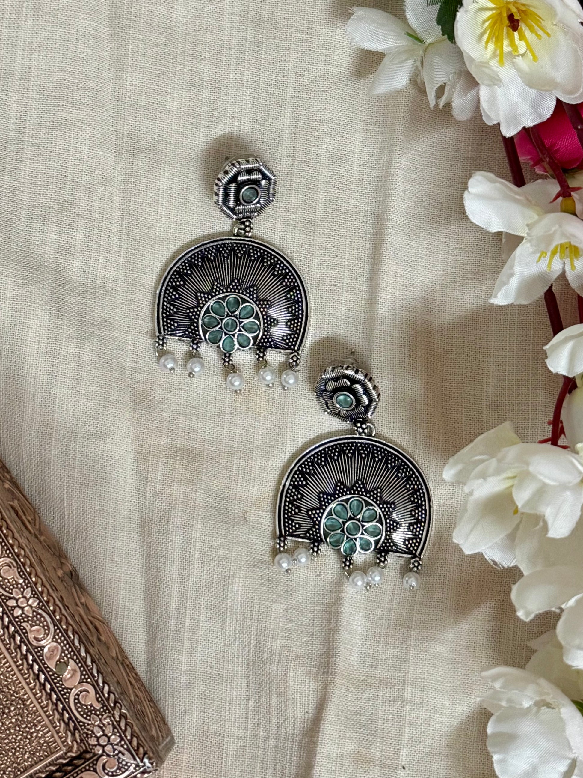 Light up your festive nights with our Chandni Earrings, designed to capture the glow and grace of the moon. With a stunning oxidised finish and delicate craftsmanship, these earrings are made to add the perfect sparkle to your Navratri and festive looks.