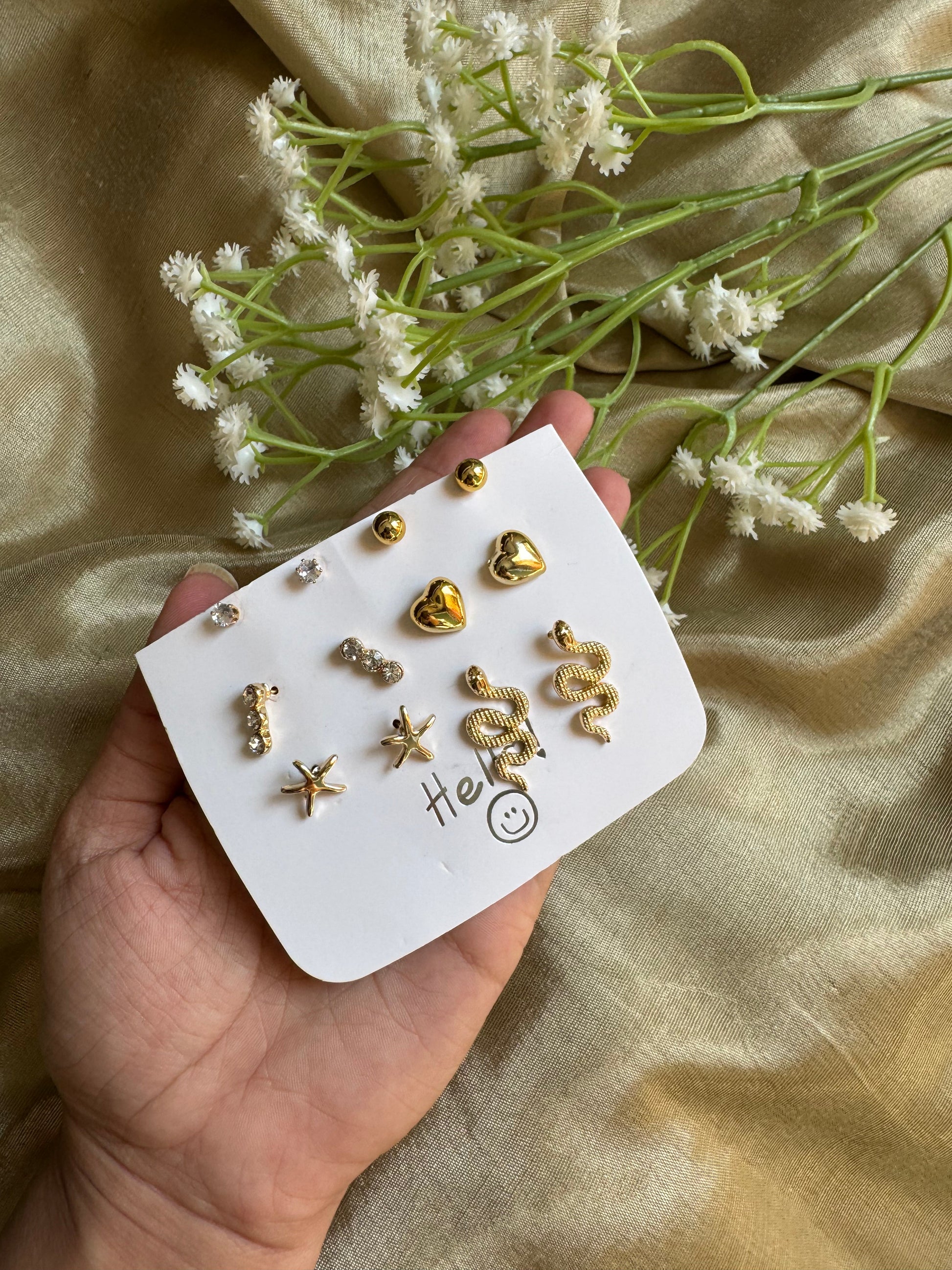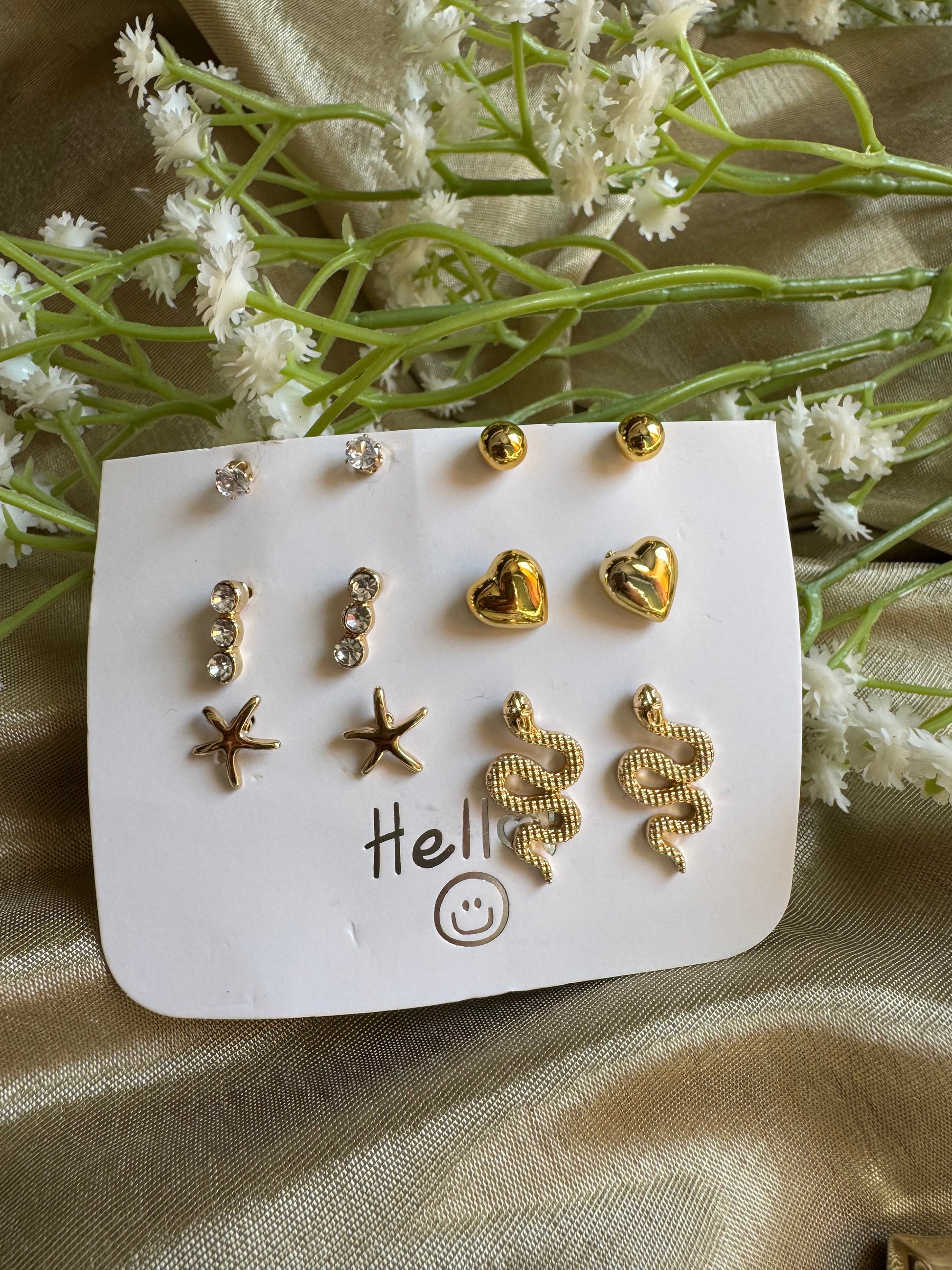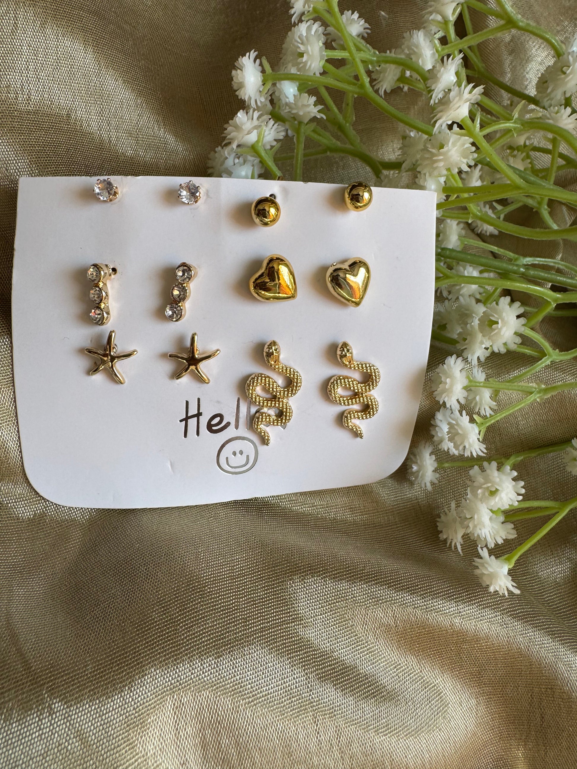 Upgrade your jewelry collection with this chic and versatile stud earring set, featuring a variety of trendy and elegant designs. From classic crystal studs to playful heart, starfish, and snake motifs, these earrings are perfect for daily wear, mix-and-match styling, or layering multiple piercings. The high-quality gold-tone finish adds a touch of sophistication, making them suitable for any occasion.