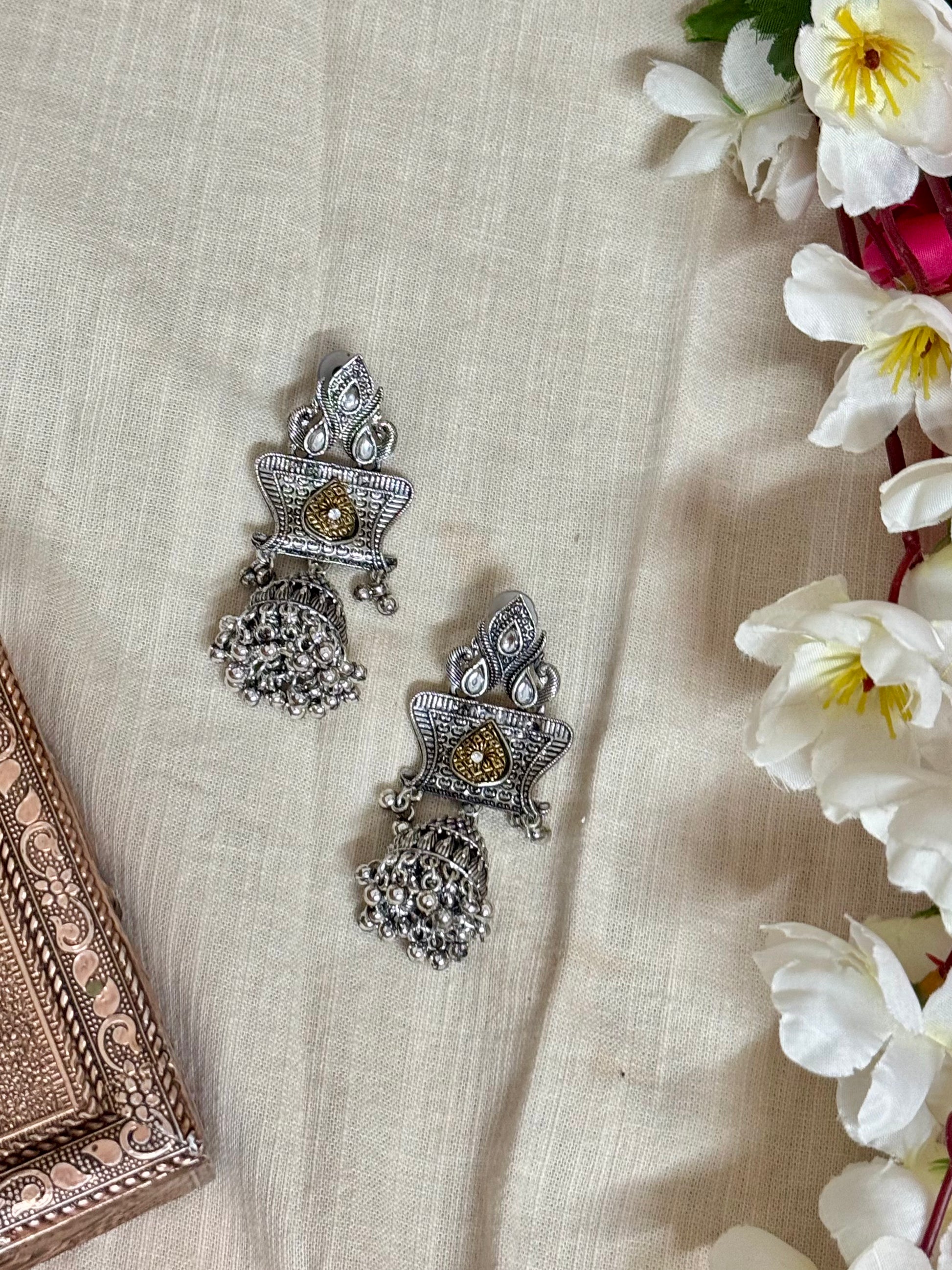 Step into the festive season with elegance and tradition wearing the Rajasi Jhumka – a beautifully crafted oxidised piece designed to add a royal touch to your Navratri look.