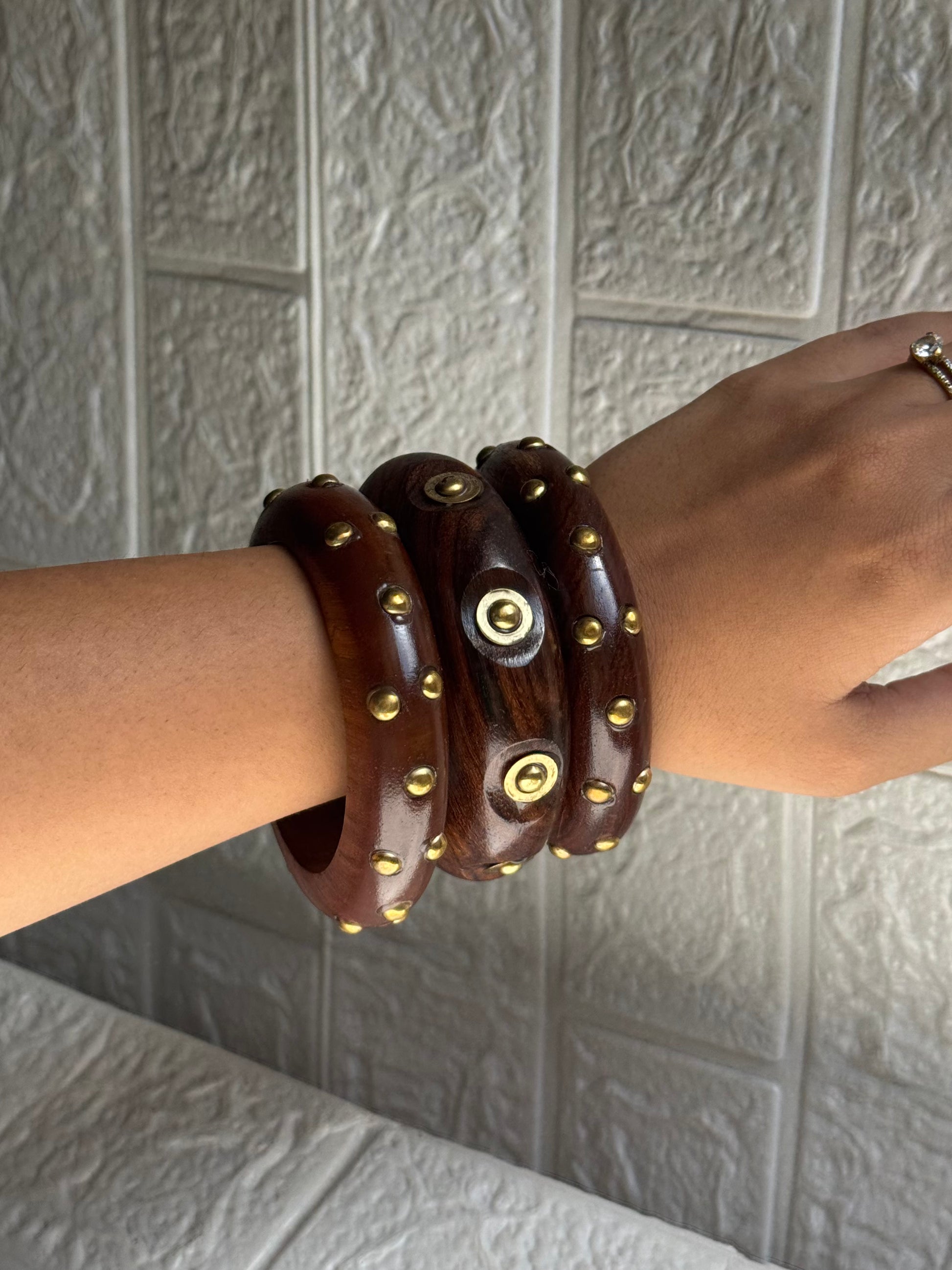 Blending timeless craft with modern design, this Rustic Stud Trio (Set of 3) is made from richly grained Keekar wood (Indian Acacia), celebrated for its durability, strength, and warm natural finish. Each bangle is adorned with gold-tone brass detailing that brings rustic elegance with a touch of boldness. Whether worn individually for subtle charm or stacked for maximum impact, these bangles add an artisanal edge to any look.
